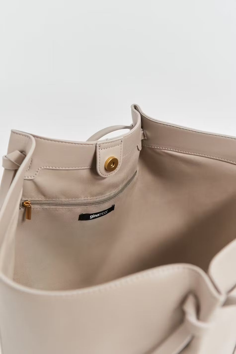 Grand sac en imitation cuir avec doubles poignées. Le sac est beige et a boucle dorée. Il a fermeture aimantée et compartiment intérieur.