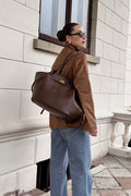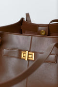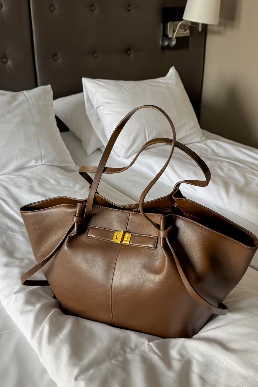 Grand sac en imitation cuir avec doubles poignées. Le sac est beige et a boucle dorée. Il a fermeture aimantée et compartiment intérieur.