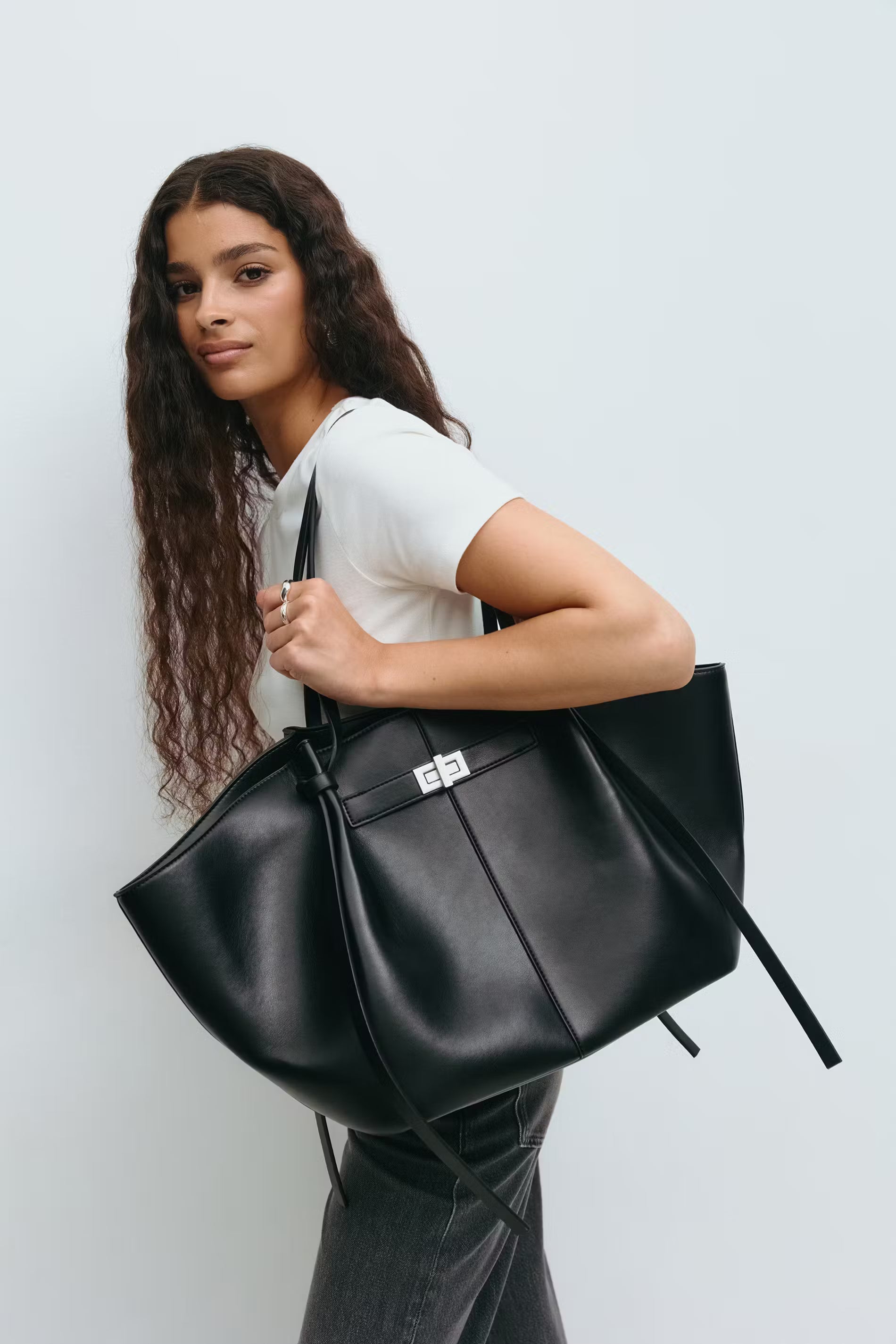 Grand sac en imitation cuir avec doubles poignées. Le sac est beige et a boucle dorée. Il a fermeture aimantée et compartiment intérieur.